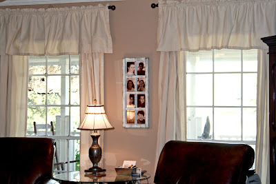 The new curtains. I got them at Tuesday Morning. I cut up one of the panels and sewed it into a valance to go across the top. I hung them closer to the ceiling to add height. The new curtain rods were on clearance. I assumed it was because they were this weird orangy-copper color. But a little spray paint fixed that right up!