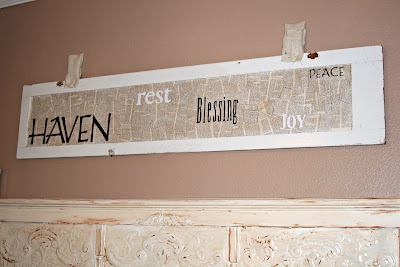 This is an old door that was in the kitchen before we re-modeled it. We tore up an old book and glued the pages to the inset and then I used my Cricut to make the words. Easy-breezy.