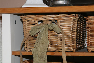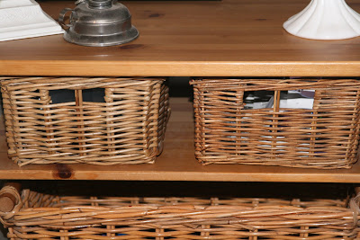 I added some ribbon to the baskets; it was leftover from other projects. I know it seems like nothing, but I think it makes a difference. For one thing you can’t see the junk in the baskets anymore. Score!